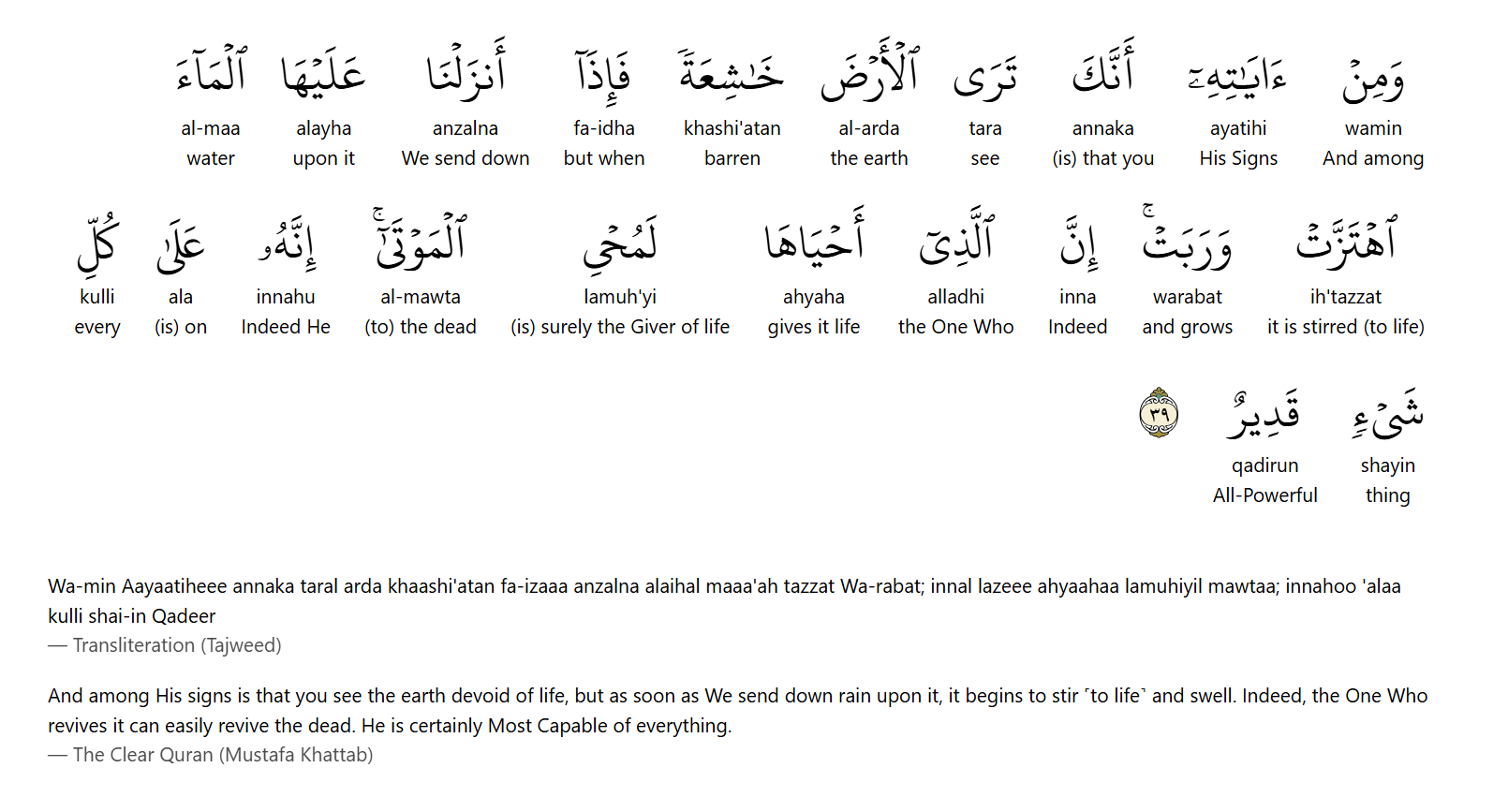 “And among His signs is that you see the earth still and lifeless, but when We send down water upon it, it stirs and swells…”