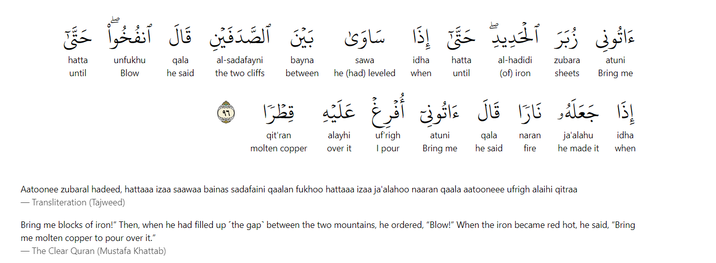 Surah al‑Kahf describes Dhul‑Qarnayn constructing a massive barrier using iron blocks, then commanding: “Bring me molten copper to pour over it.”