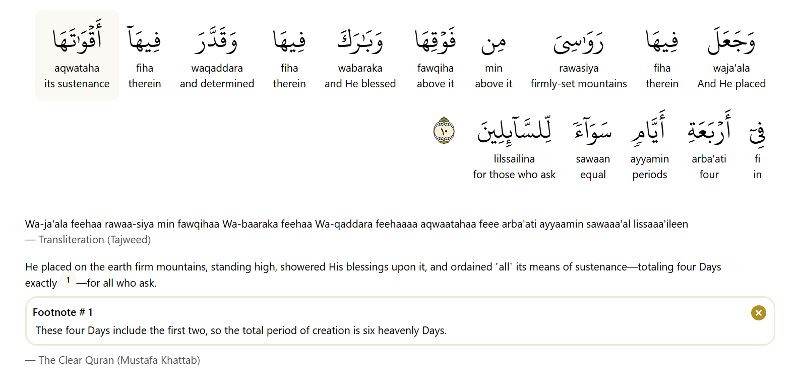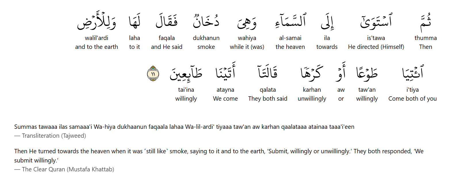 “Say, do you indeed disbelieve in He who created the earth in two days… Then He turned to the heaven when it was smoke and said to it and to the earth, ‘Come willingly or unwillingly,’ and they said, ‘We come willingly.’ And He completed them as seven heavens in six days…”